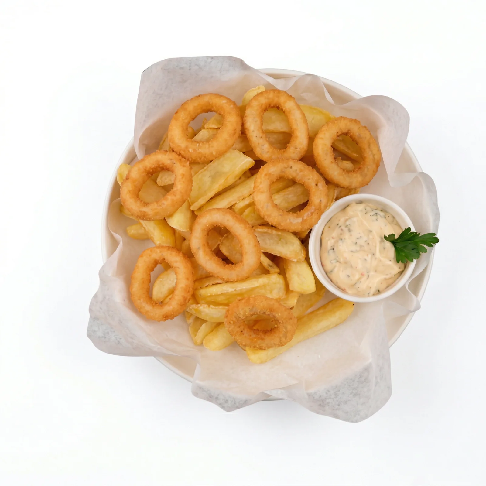 Soğan halkaları, kaşık patates ve bang bang sos ile