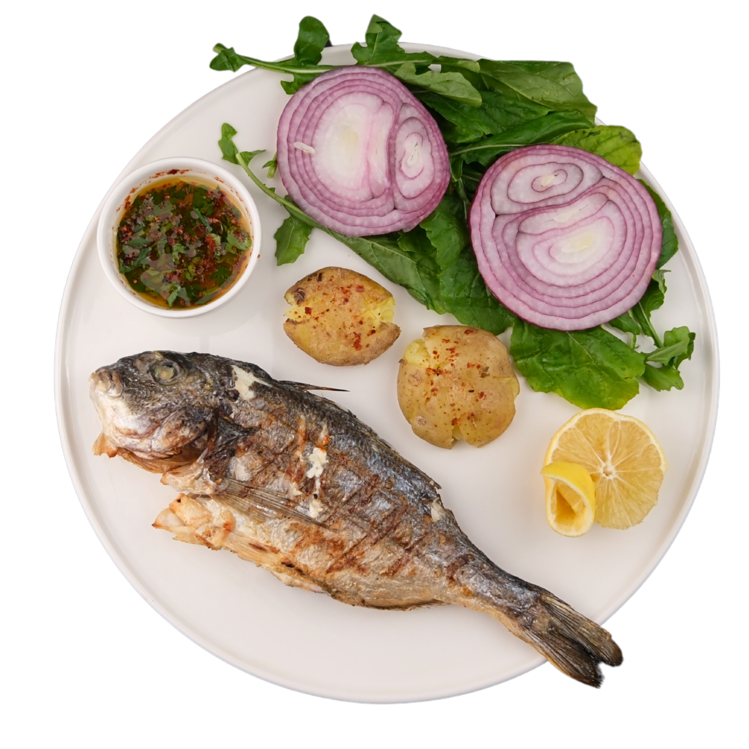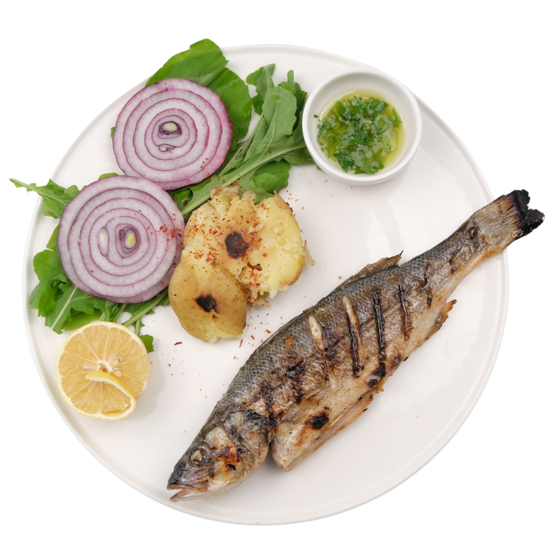 Bütün çupra, baby roka, çeri domates, kırmızı soğan halkaları, limon (isteğe göre maydanozlu sos), baharatlı haşlanmış patates ile