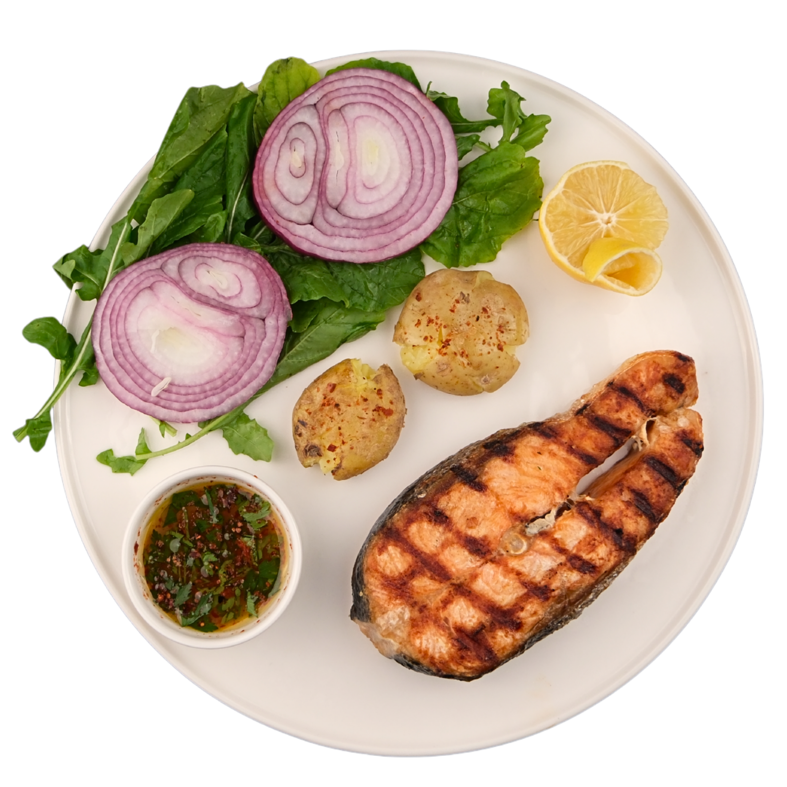 Somon, baby roka, kırmızı soğan halkaları, limon (isteğe göre maydanozlu sos), baharatlı haşlanmış patates ile