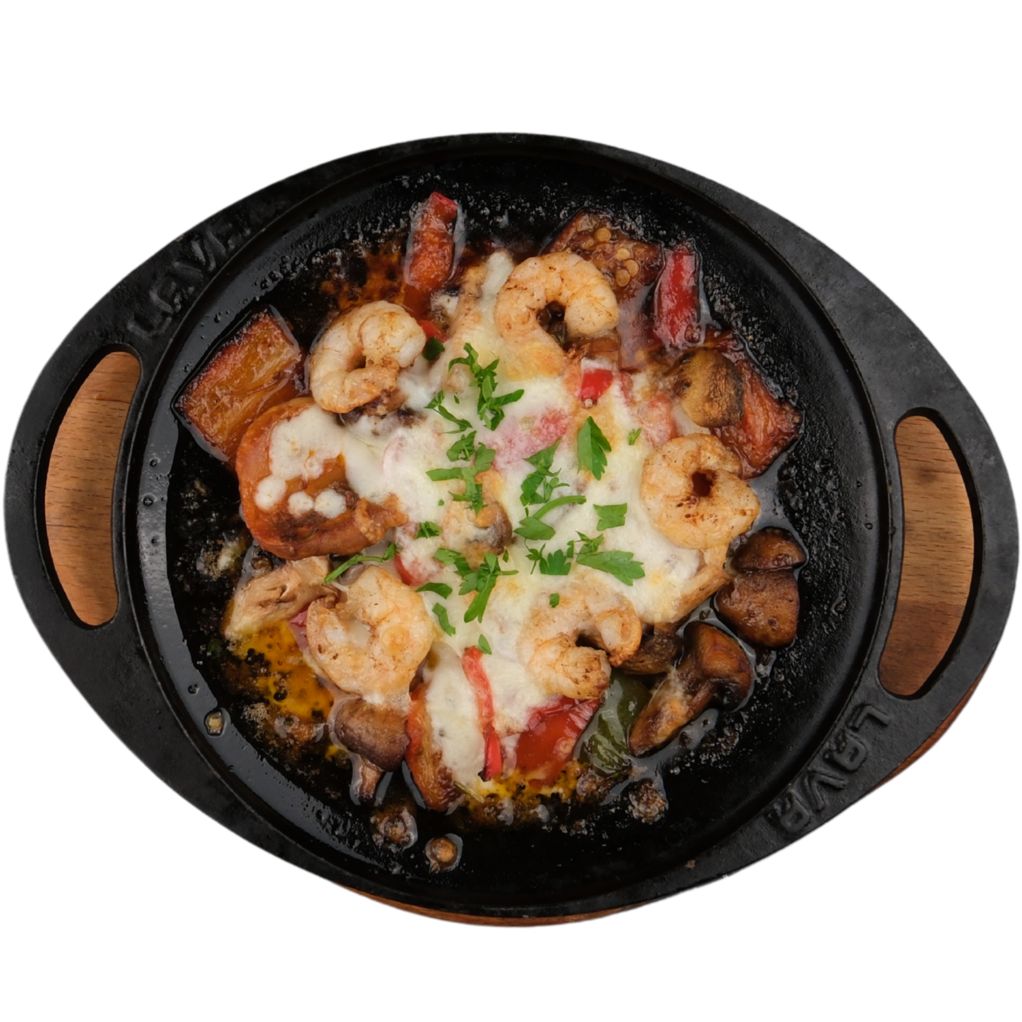 Güveçte çimçim karides, yeşil biber, kırmızı biber, mantar, kaşar peyniri