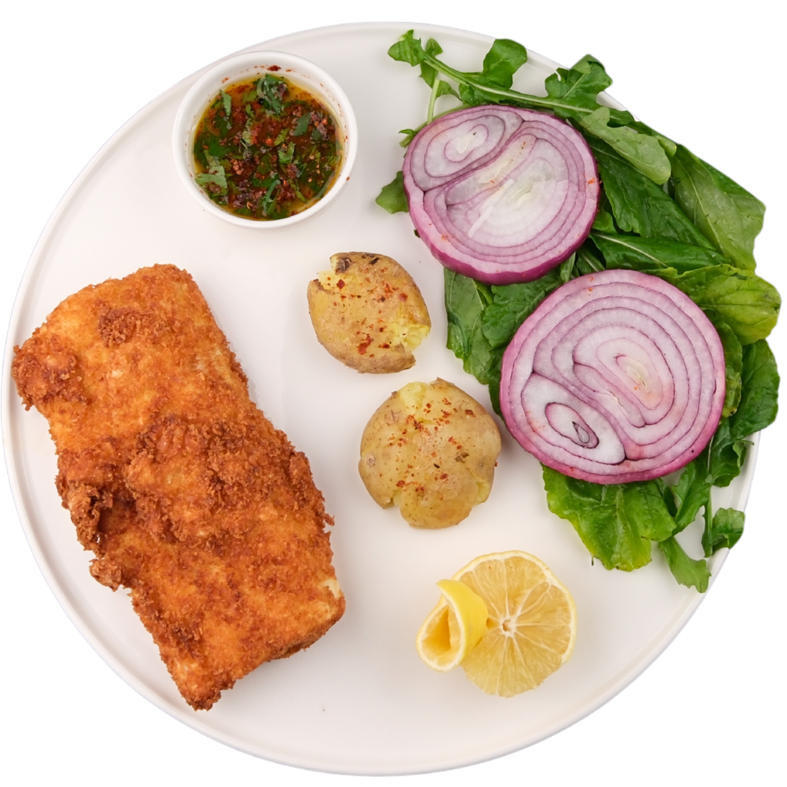 Mevsim balıkları (4 çeşit) Roka yaprakları, kırmızı soğan, baby patates, maydonozlu limon sos ile