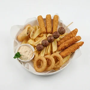 Çıtır tavuk, Kaşık Patates, Mozarella Stick, Misket Köfte Şiş, Soğan Halkası, Çin Böreği ve Bang Bang sos ile servis edilir.