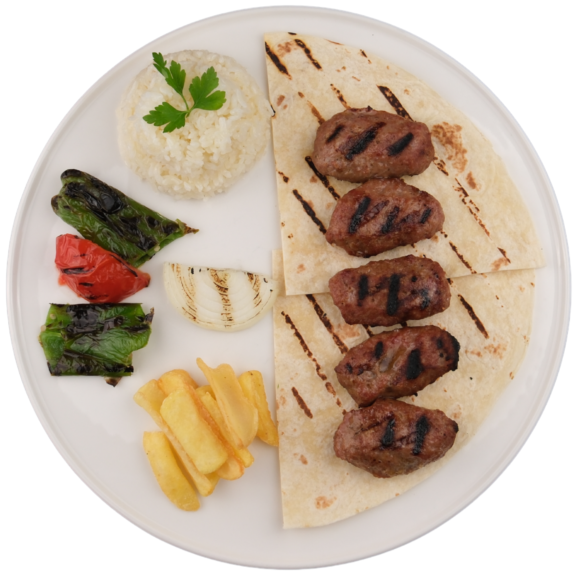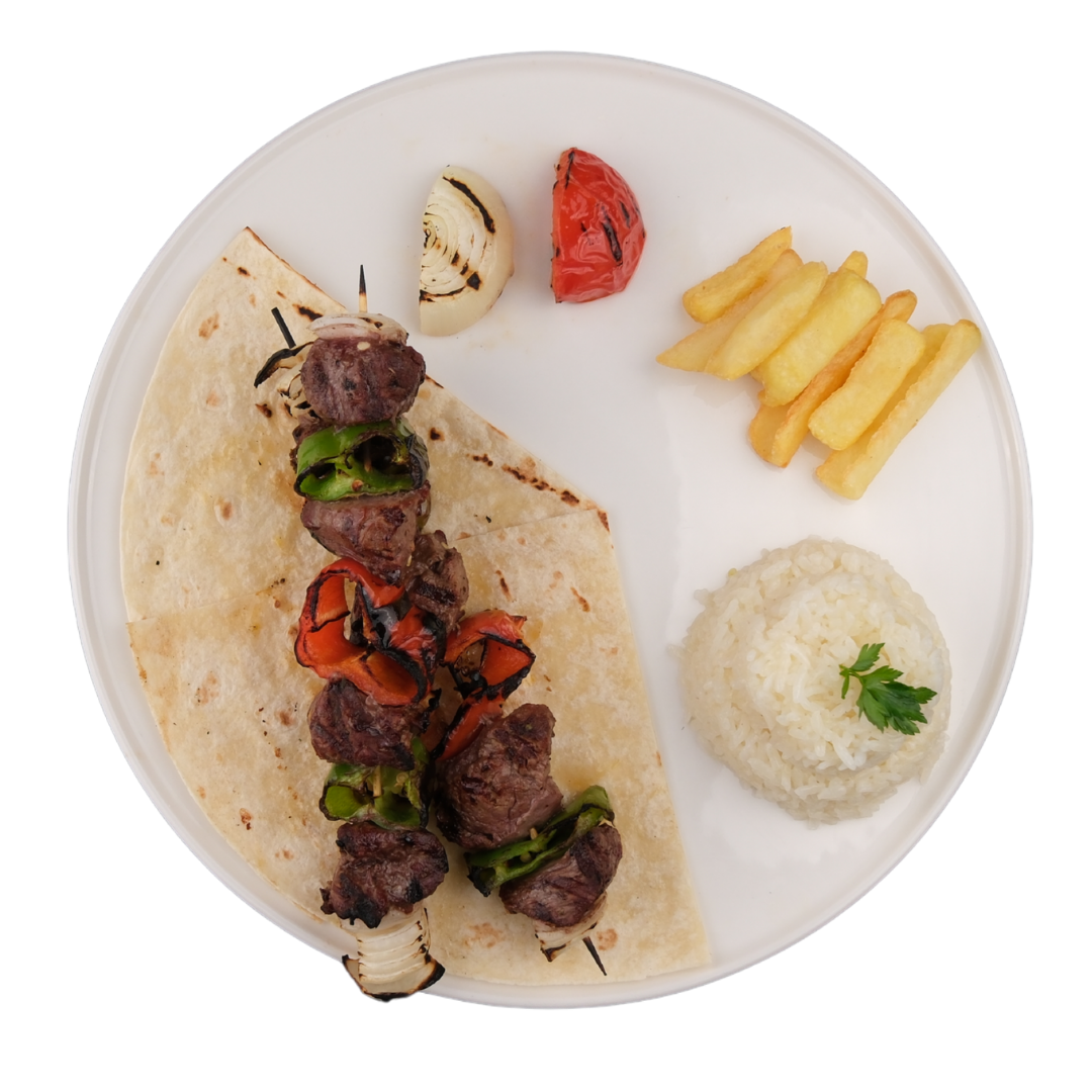 Dana Çöp Şiş, Tavuk Çöp Şiş, Izgara Köfte, Dana Bonfile, Izgara Domates, Izgara Biber, Izgara Soğan, Pirinç Pilavı, Kaşık Patates, Bang-Bang Sos, Lavaş ile