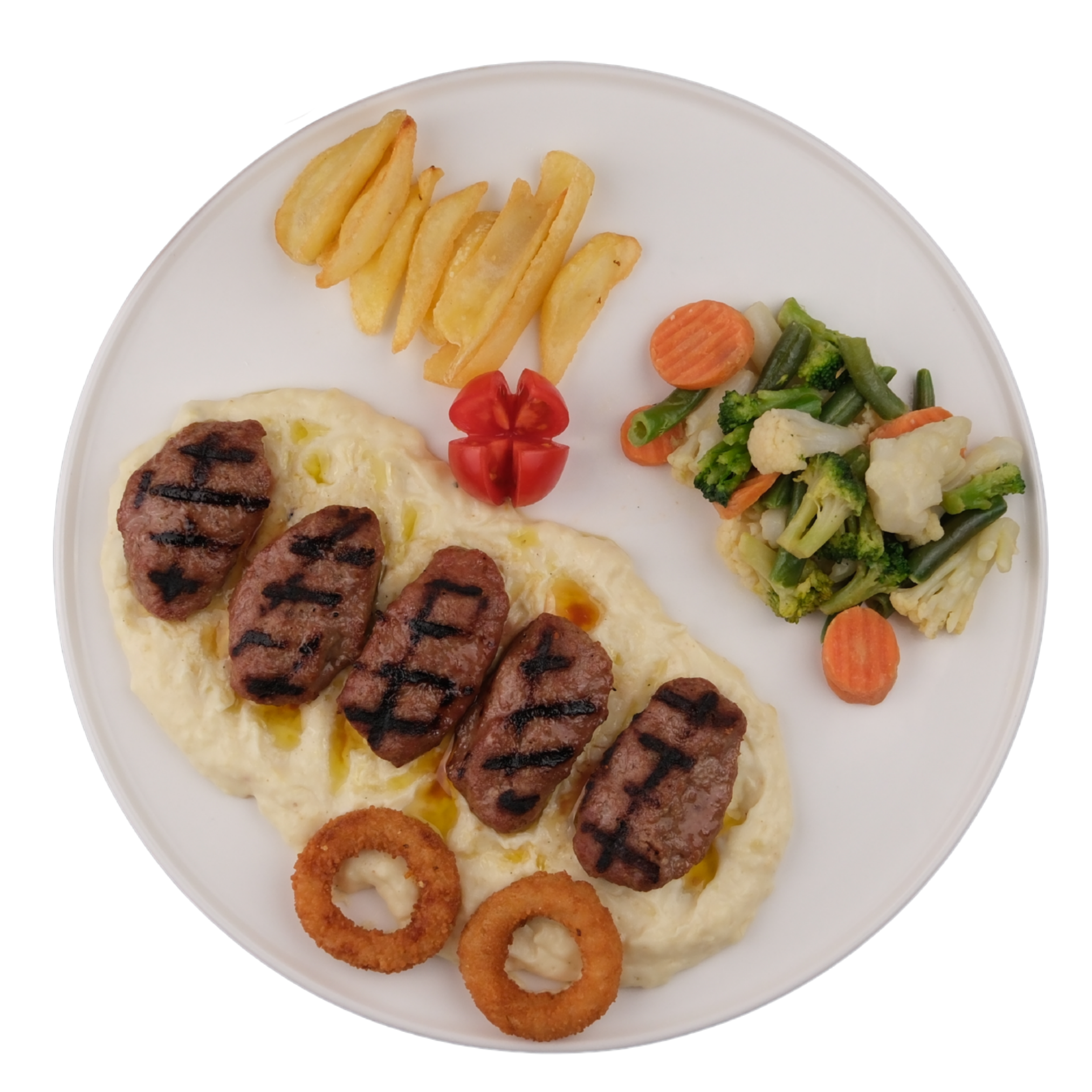 Izgara köfte, patlıcan beğendi, sebze mix, kaşık patates, soğan halkası ile