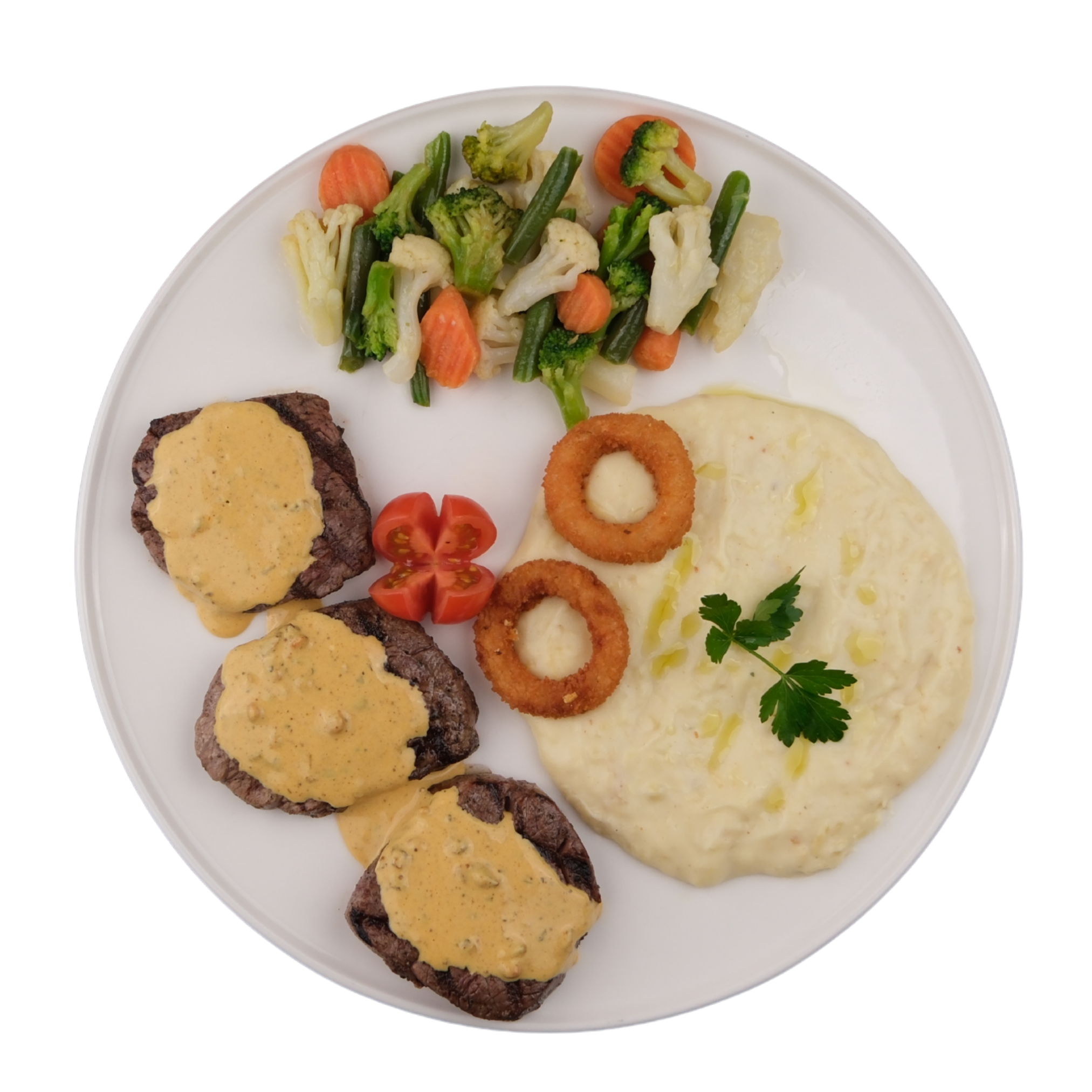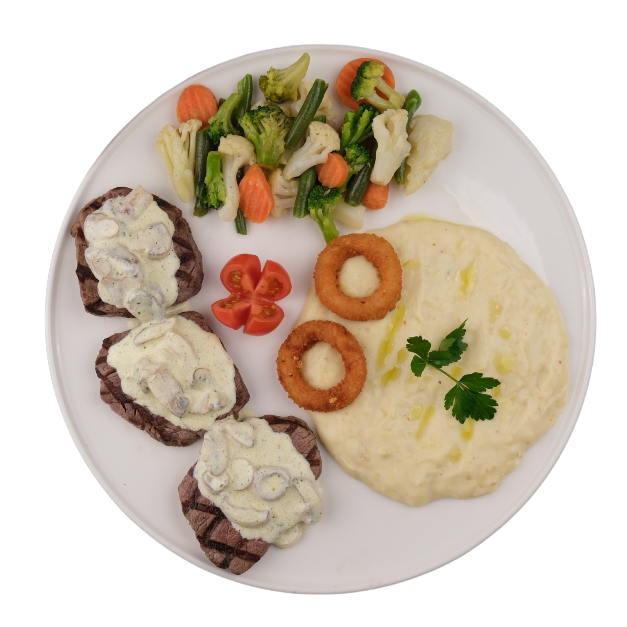Dana bonfile, mantarlı kremalı sos, patlıcan beğendi, ızgara sebze mix, soğan halkası ile