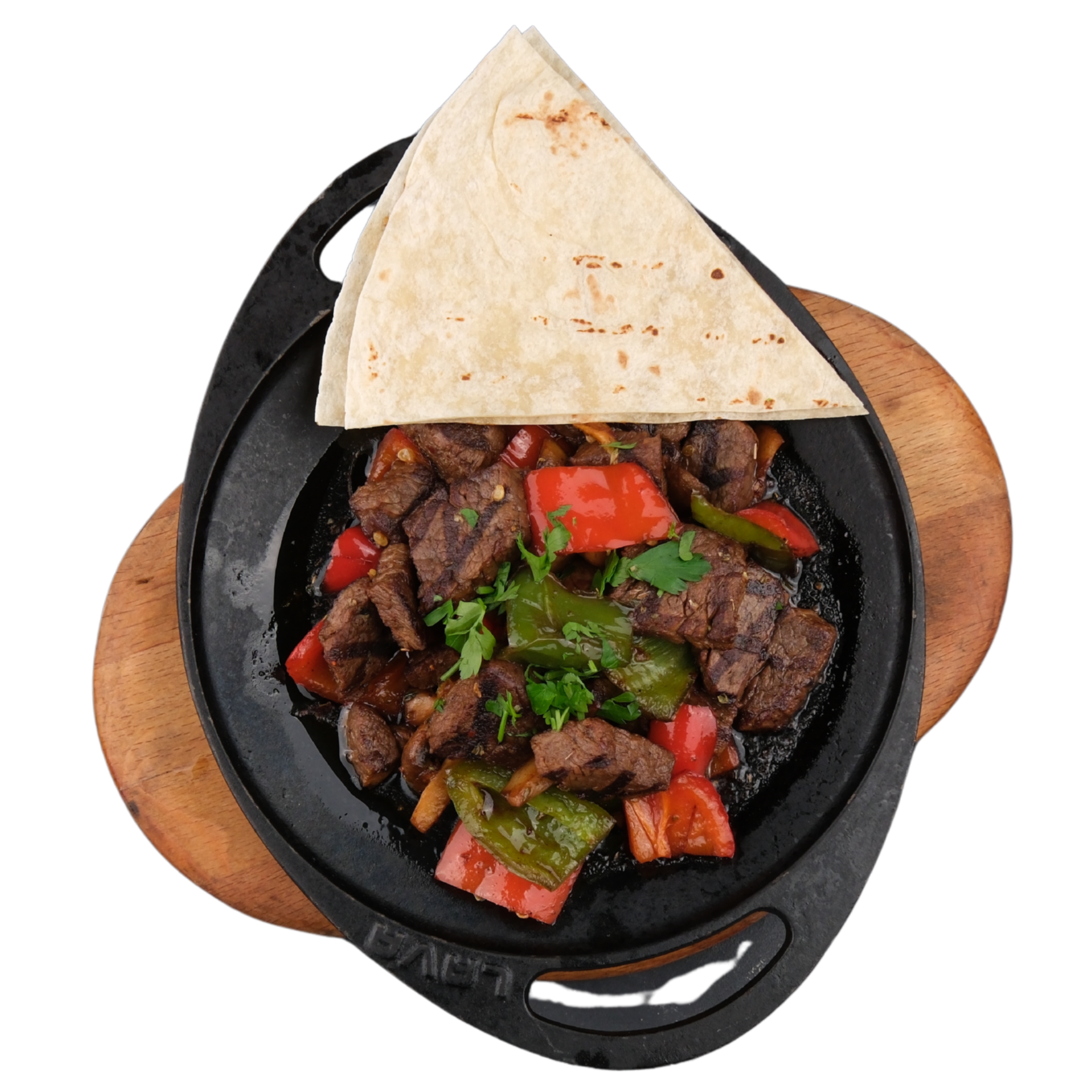 Dana bonfile dilimleri, renkli biberler, soğan, mantar, domates, lavaş ile