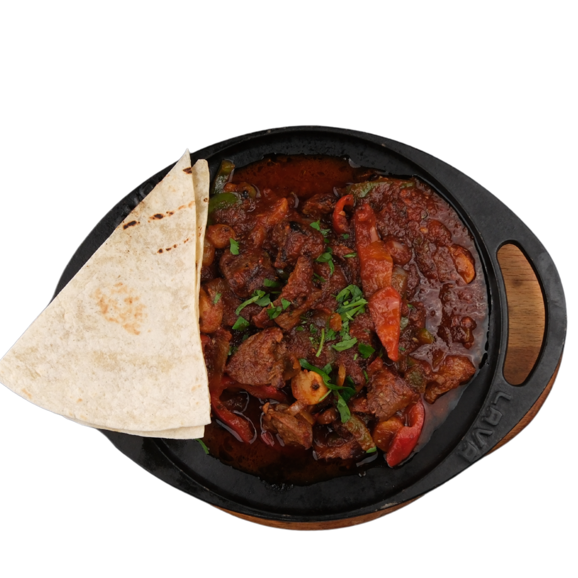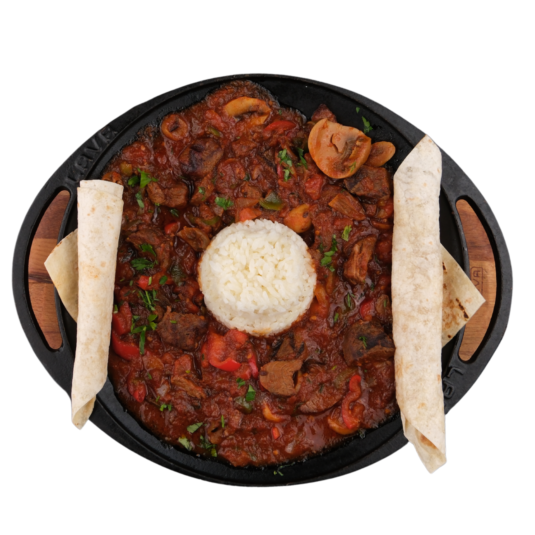 Dana bonfile dilimleri, renkli biber, mantar, soğan, domates sos, lavaş ile