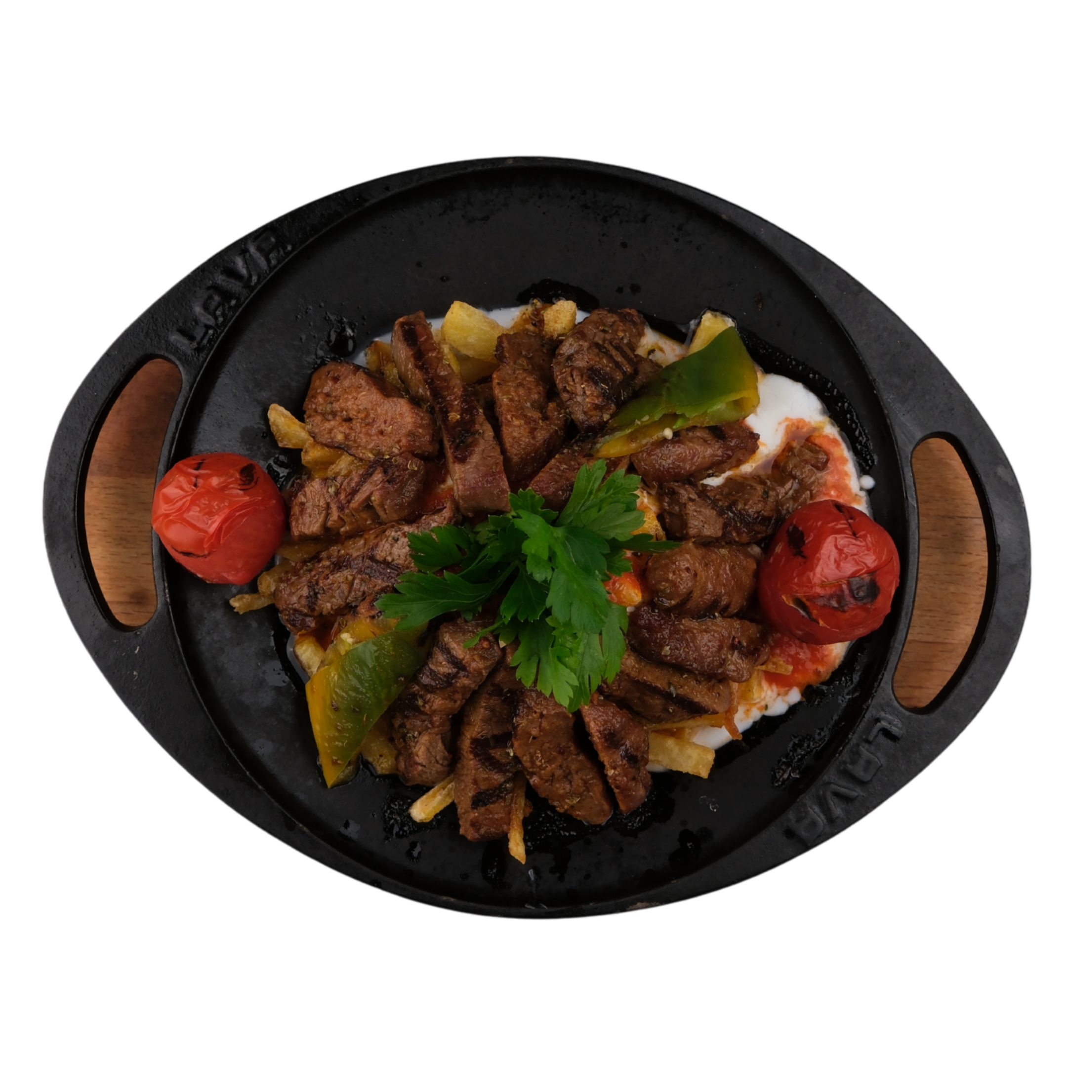Dana bonfile dilimleri, ızgara köfte dilimleri kibrit patates, süzme yoğurt, tereyaglı domates sos, ızgara domates, ızgara biber ile