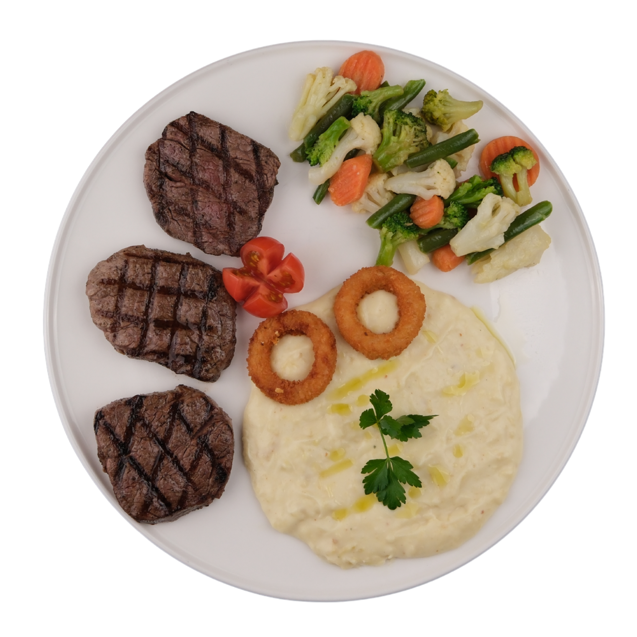 IzgaraDana bonfile, patlıcan beğendi, sebze mix, soğan halkası ile