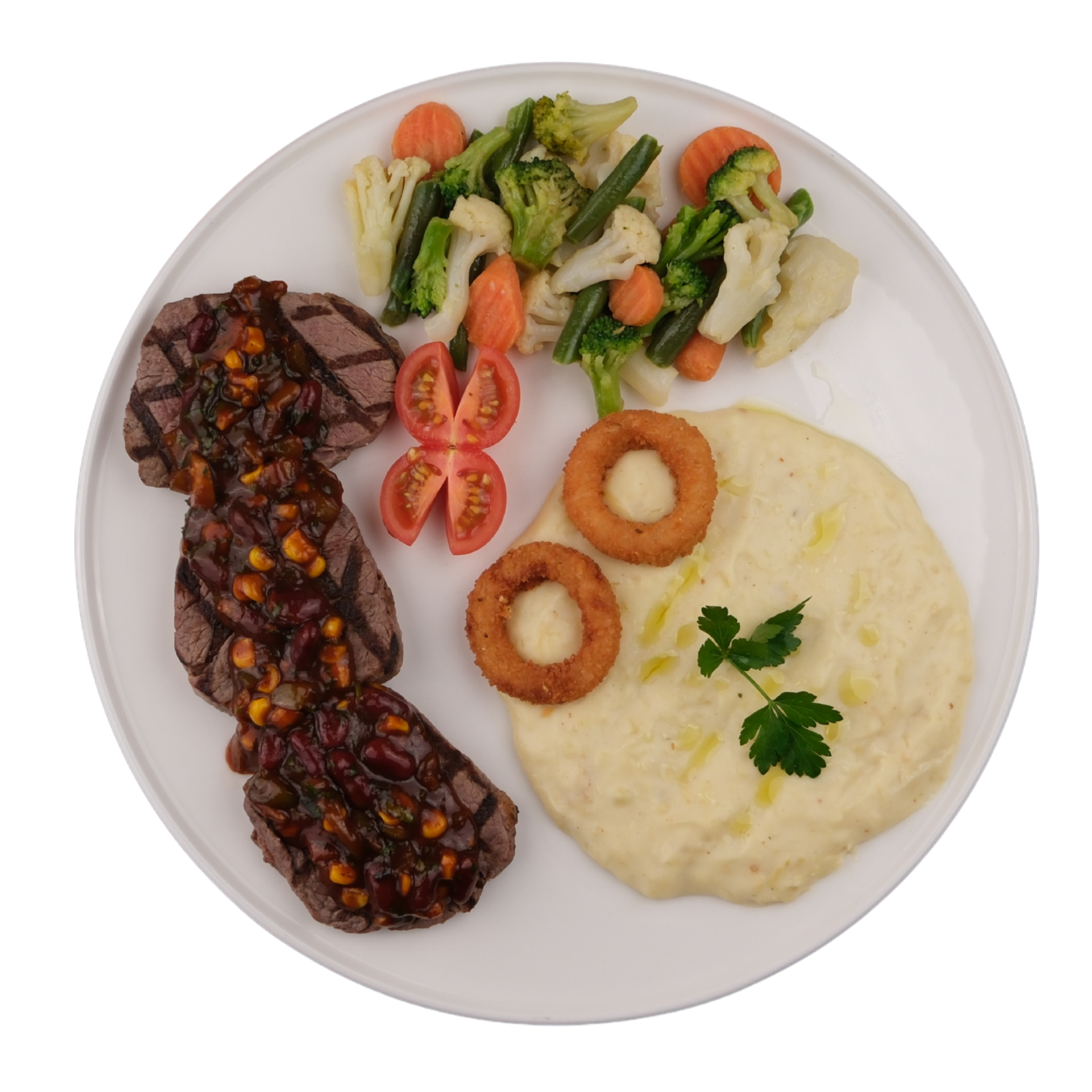 Dana bonfile, acılı meksika püre, patlıcan beğendi, sebze mix, soğan halkası ile