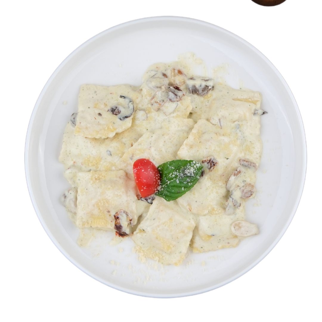 Kremalı mantar, kurutulmuş domates, pesto sos, parmesan ile
