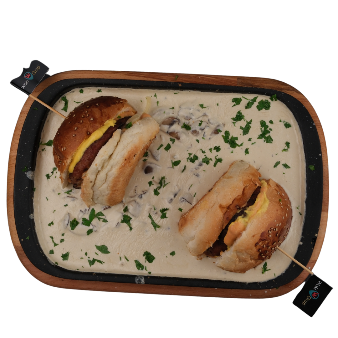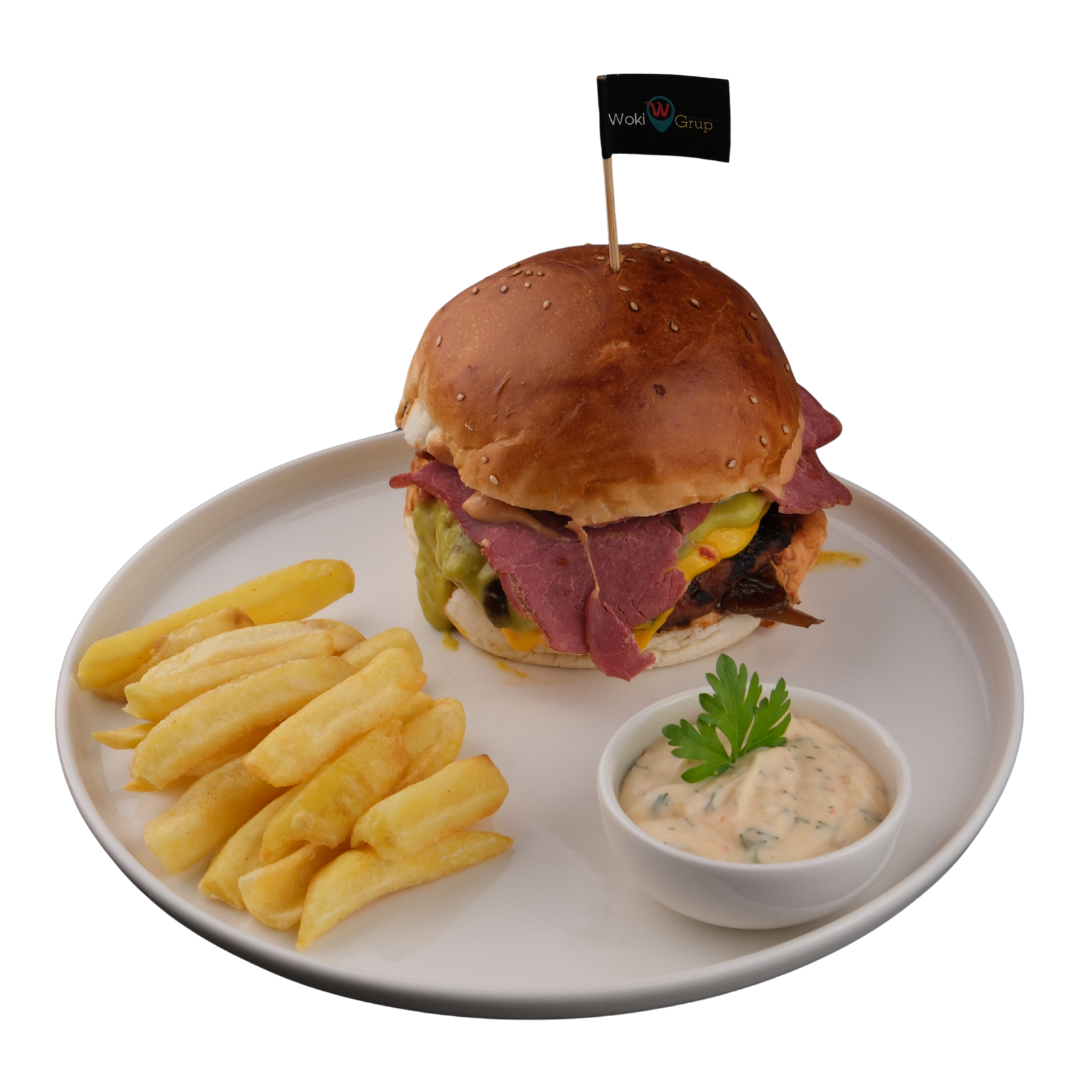Woki özel burger sos, burger Köftesi, karamelize soğan, cheddar peynir, mantar,köz biber, kaşık patates ve bang bang sos ile