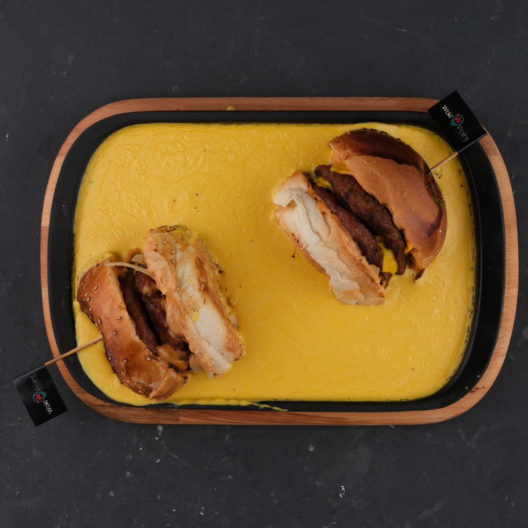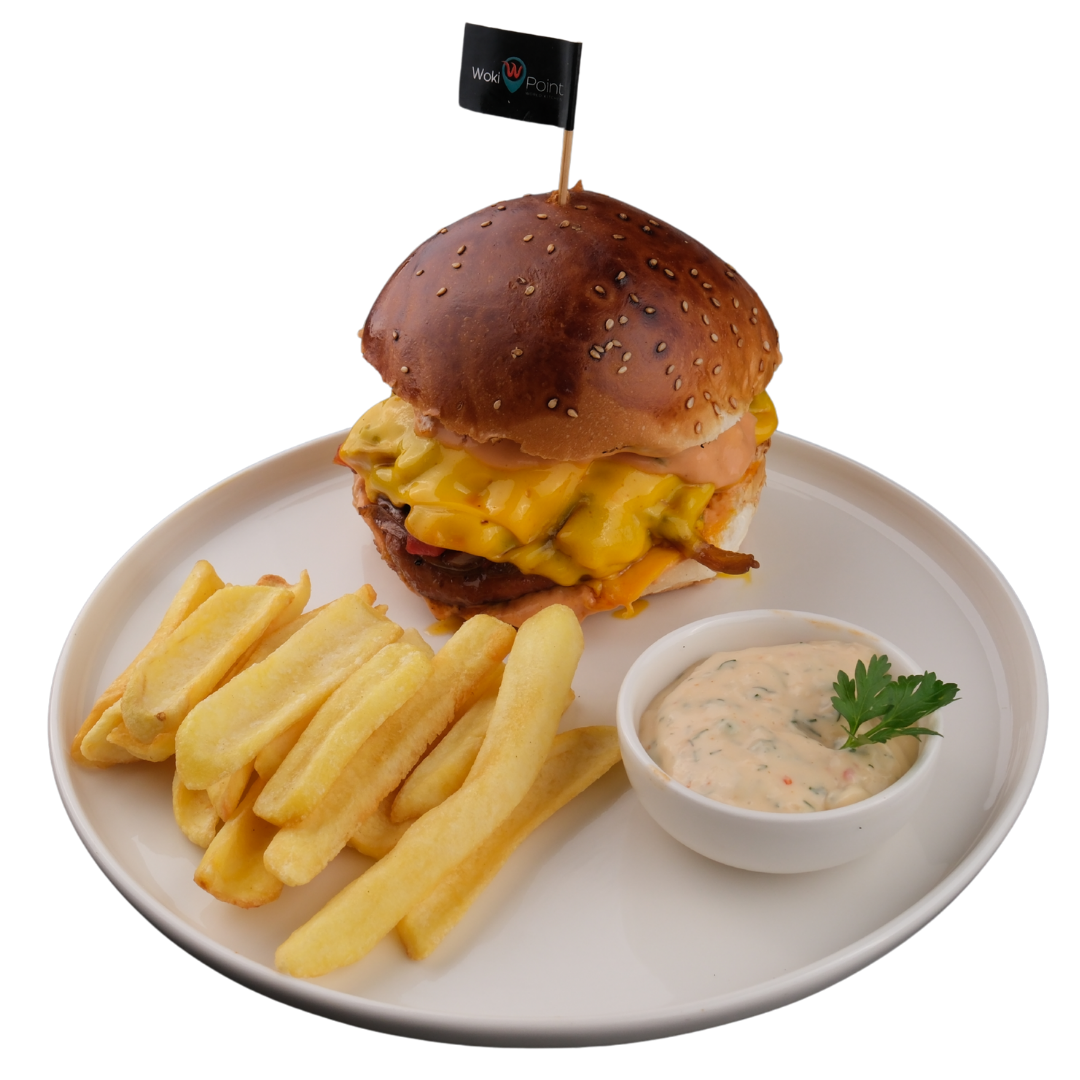 Woki özel burger sos, ikili burger köftesi,karamelize sogan, peynir şelalesi kaşık patates ve bang bang sos ile