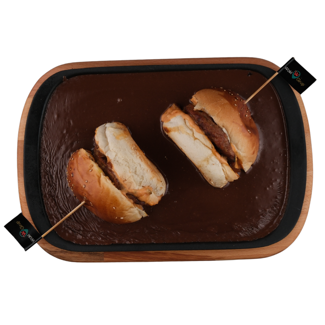 Woki özel burger sos, burger köftesi,cheddar peyniri, karamelize sogan, özel cikolata sos, kaşık patates ve bang bang sos ile