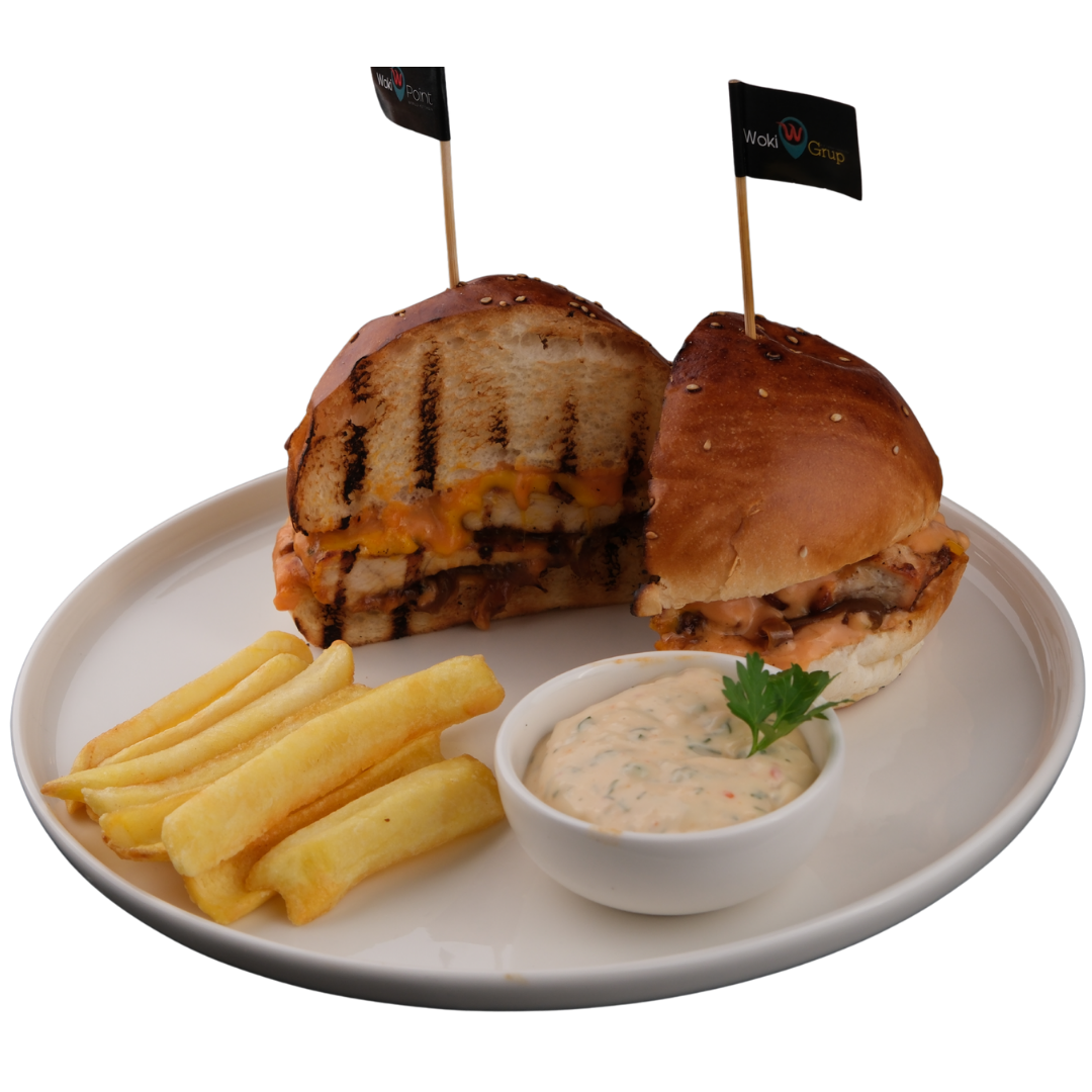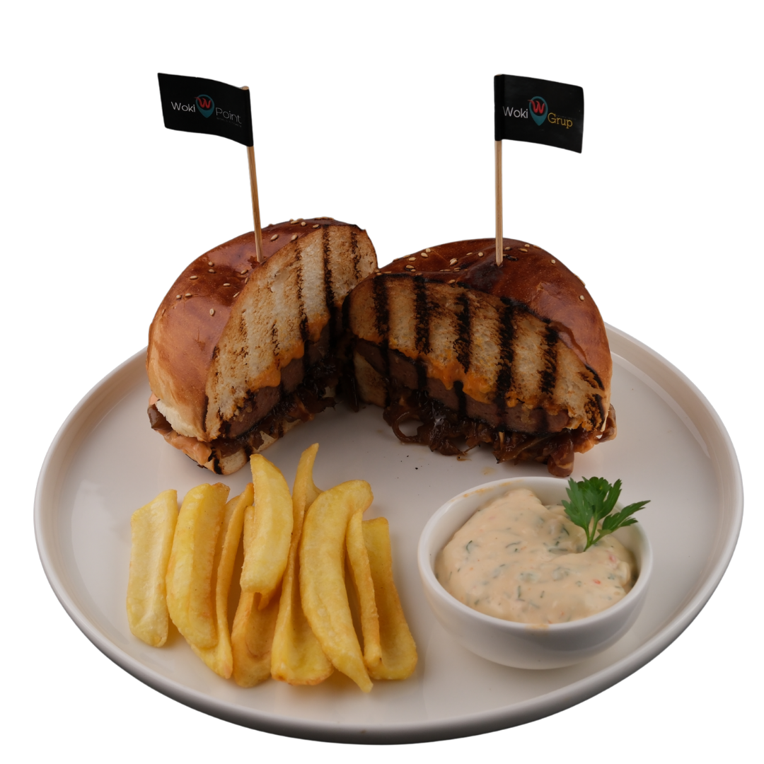 Woki özel burger sos, burger köftesi, karamelize soğan, kaşık patates ve bang bang sos ile