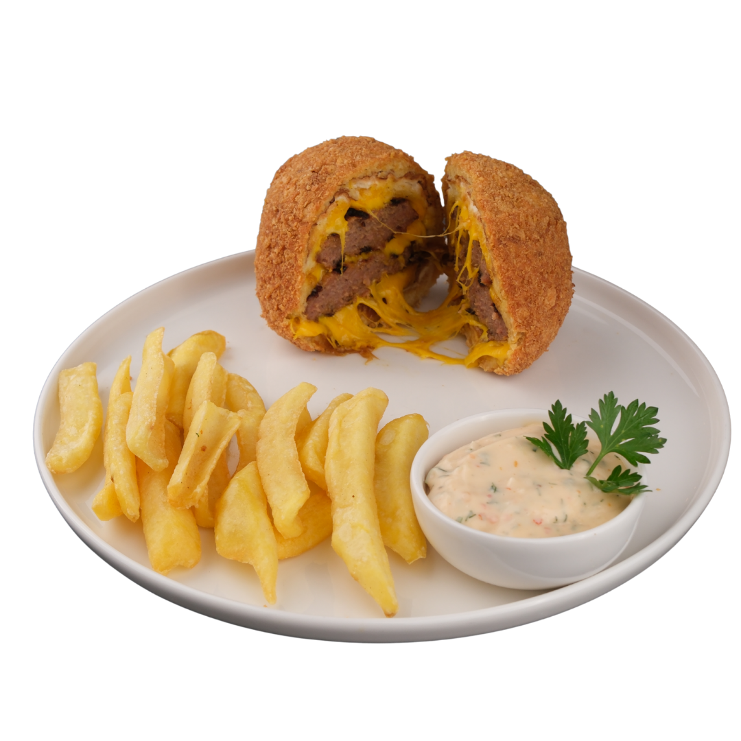 Woki özel sos, burger köftesi, karamelize sogan, cheddar peyniri, özel pane harcıyla çıtırlaştırılmış gülle burger, kaşık patates ve bang bang sos ile