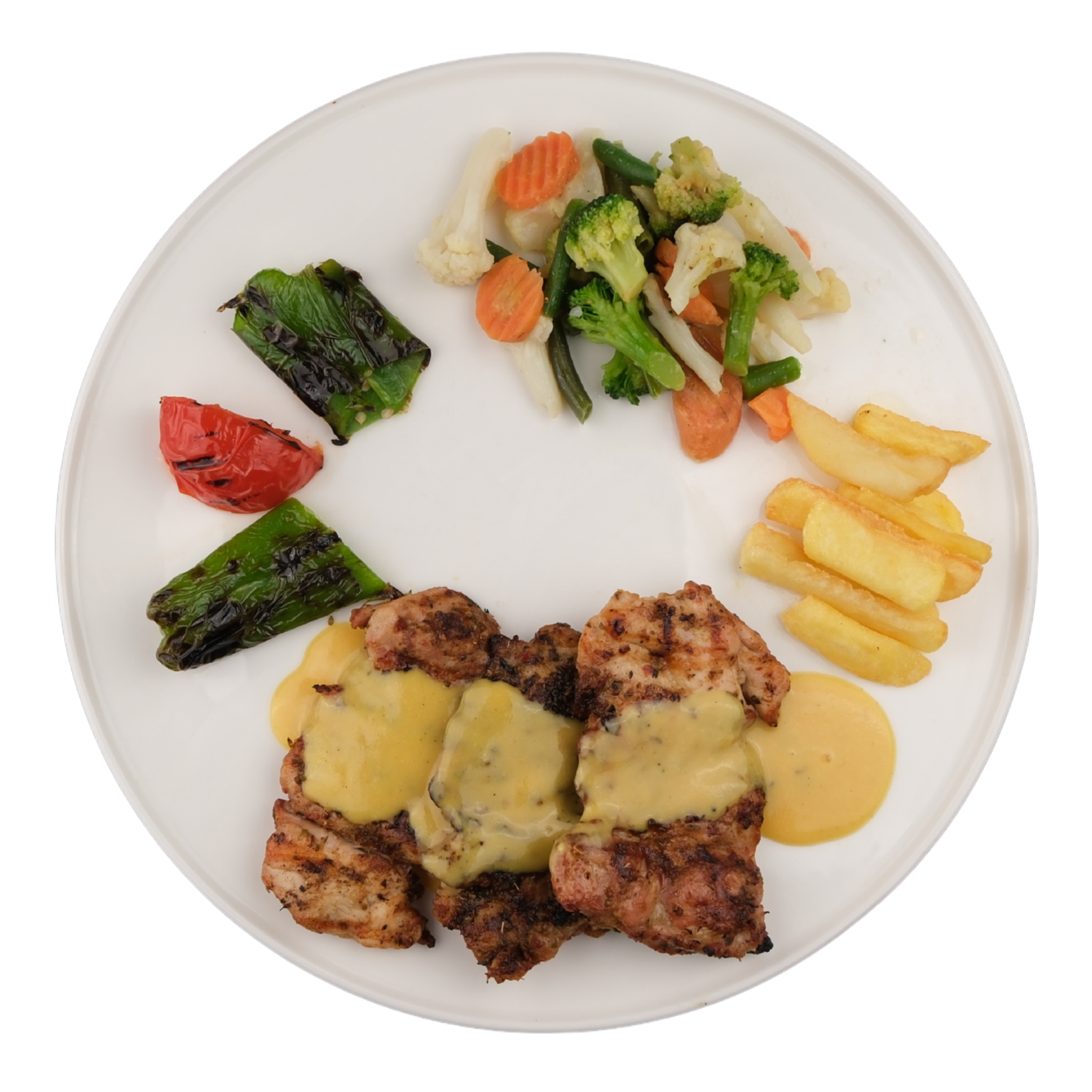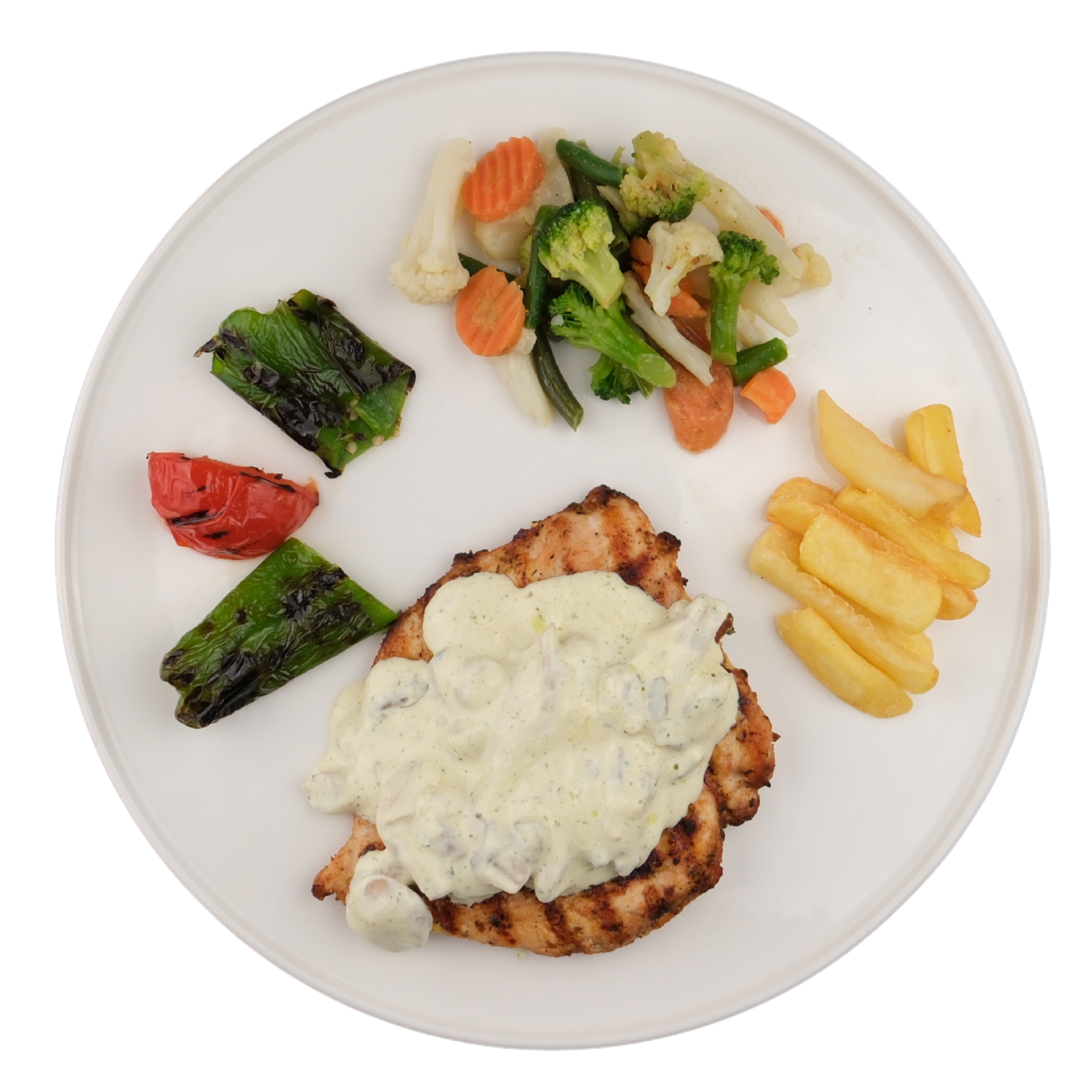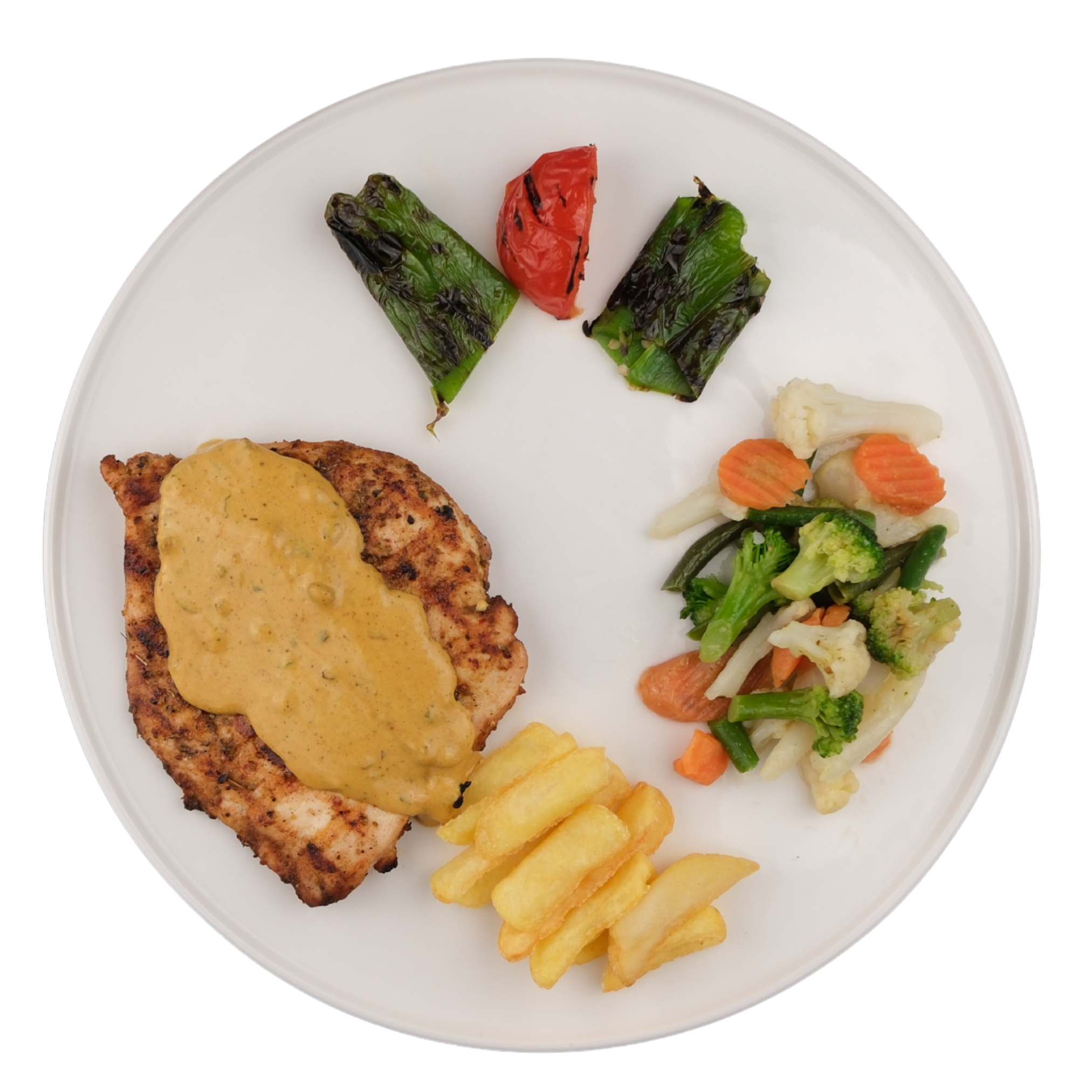 Izgara tavuk göğüs, fırında sebze mix, cafe de paris sos, ızgara domates, ızgara biber, kaşık patates ile
