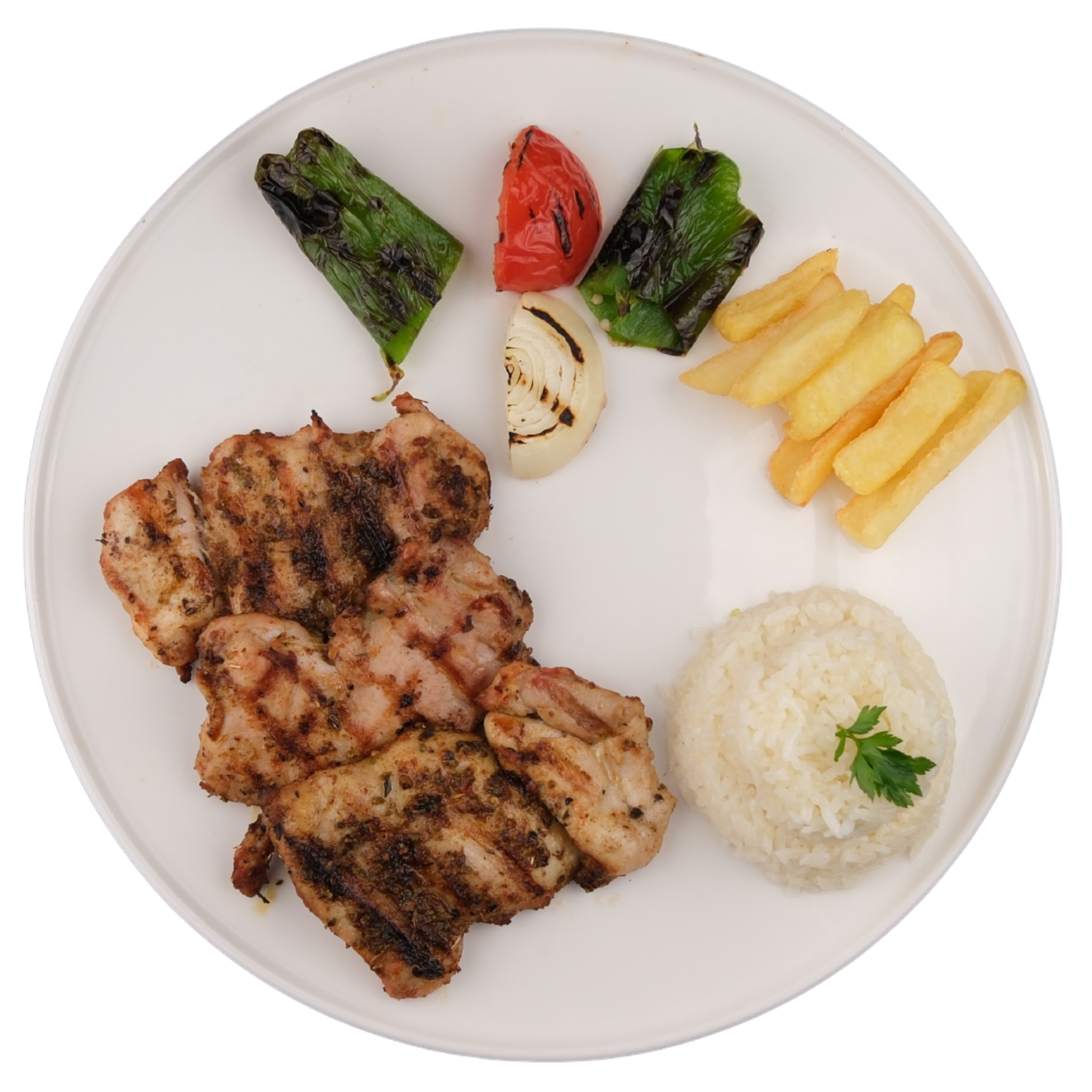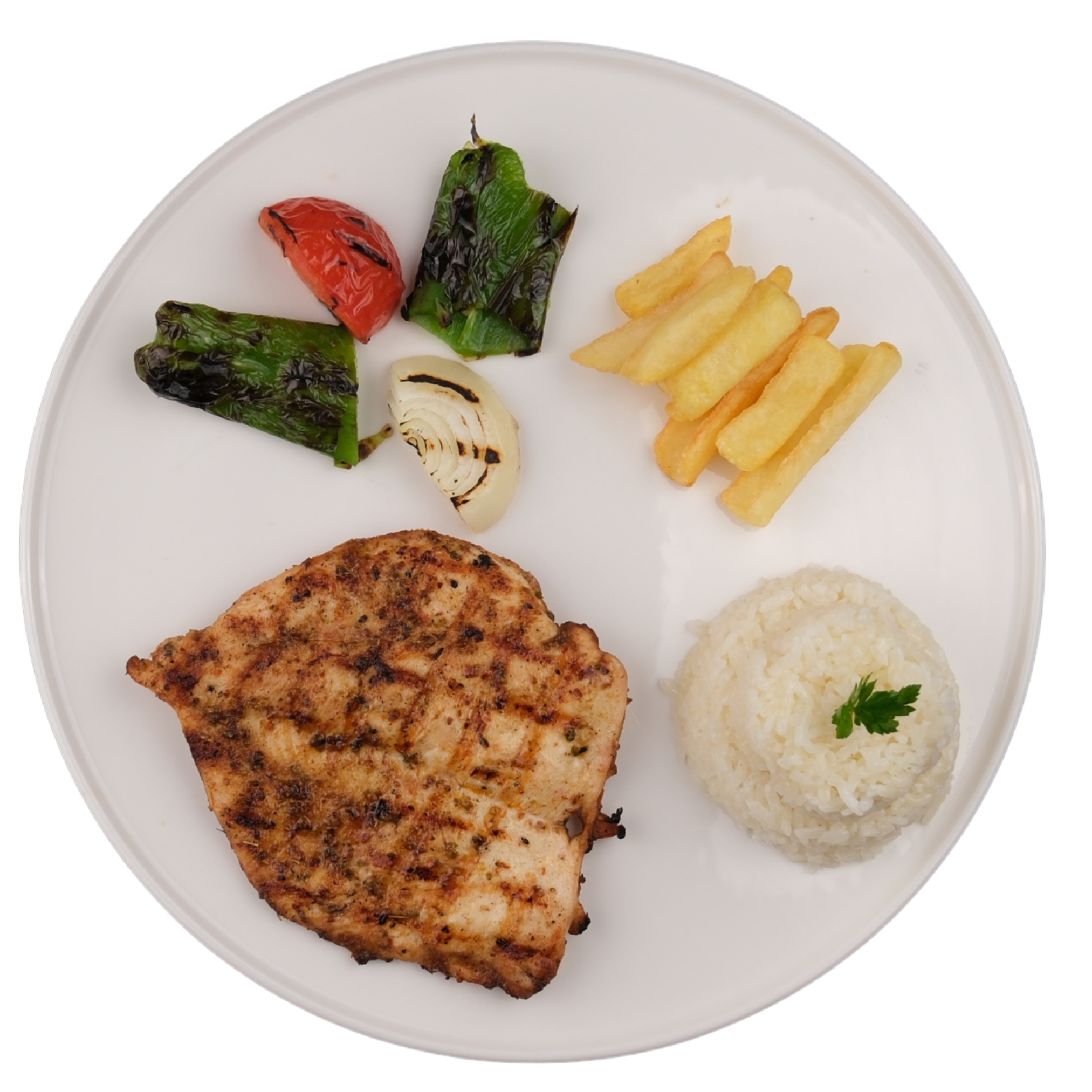 Izgara tavuk göğüs, pirinç pilavı, ızgara domates, ızgara biber, soğan, kaşık patates ile