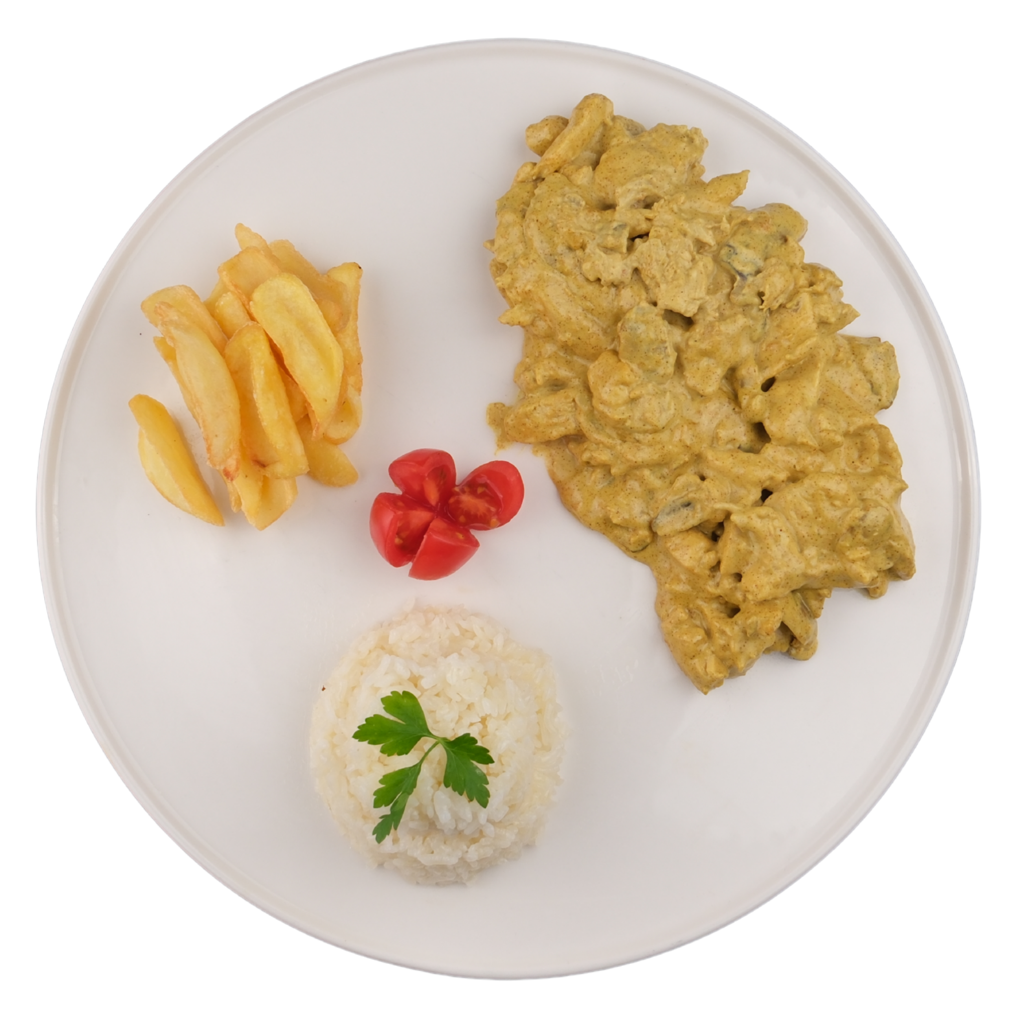Sote tavuk göğüs,pirinç pilavı, köri sos, çeri domates,kaşık patates ile