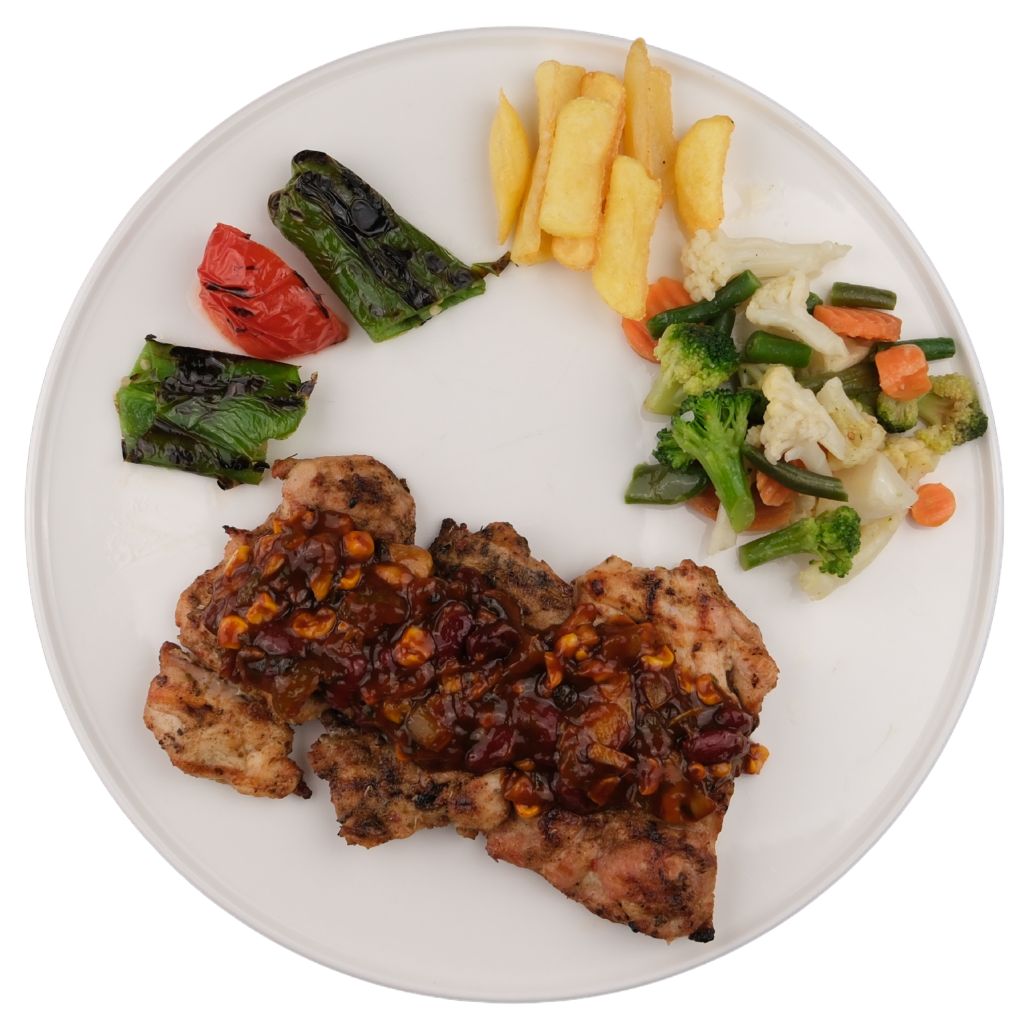 Izgara tavuk pirzola, jalepeno biberli acı sos, mexica fasulyesi, fırında sebze mix, ızgara domates, ızgara biber, kaşık patates ile