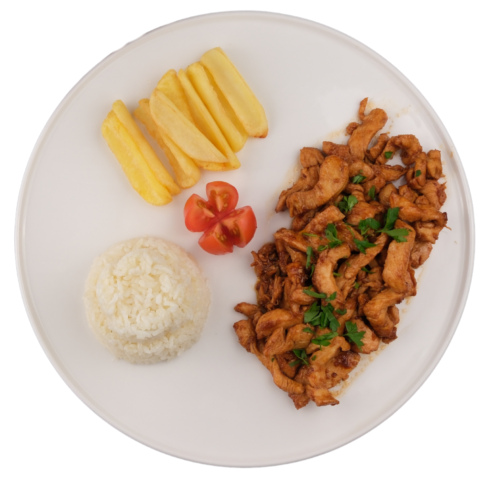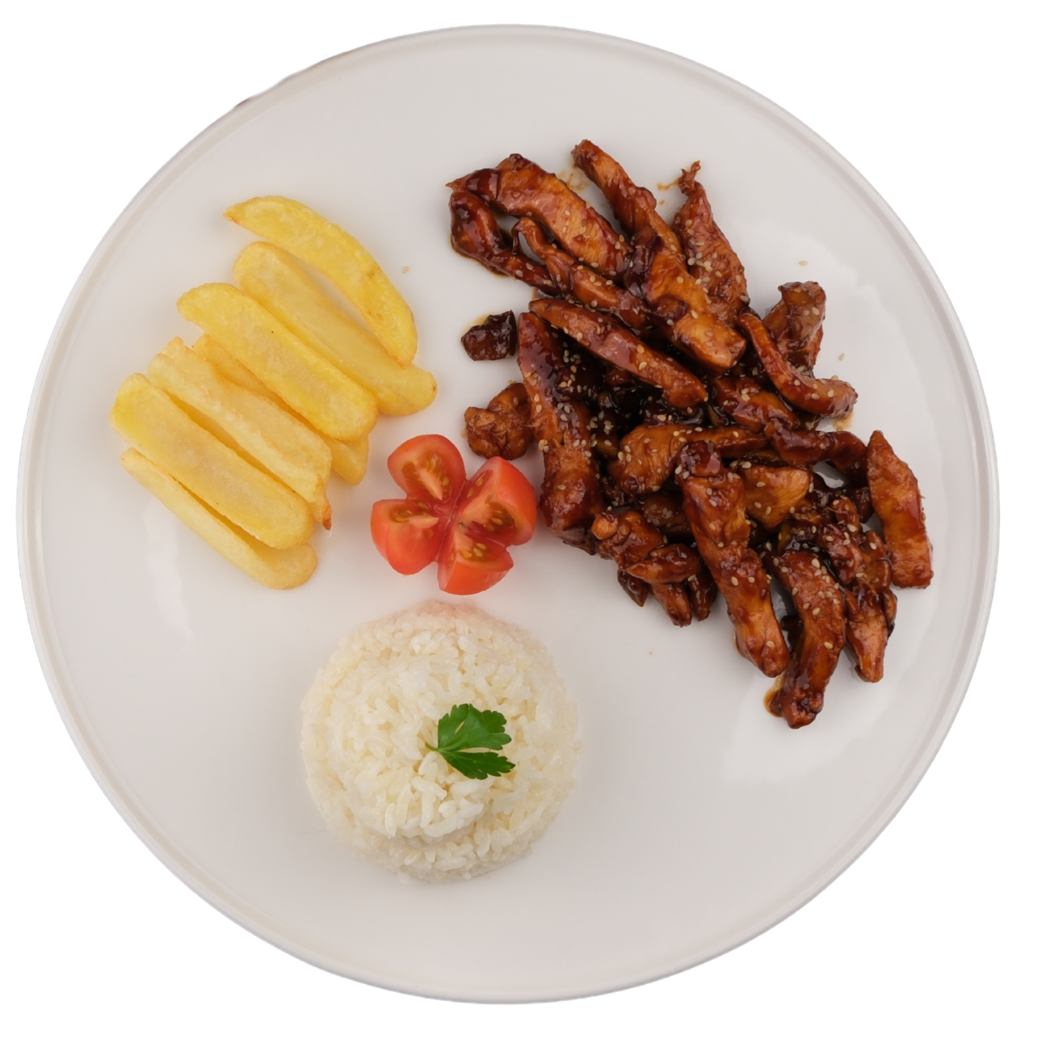 Jülyen tavuk, teriyaki sos, pirinç pilavı, çeri domates, kaşık patates ile