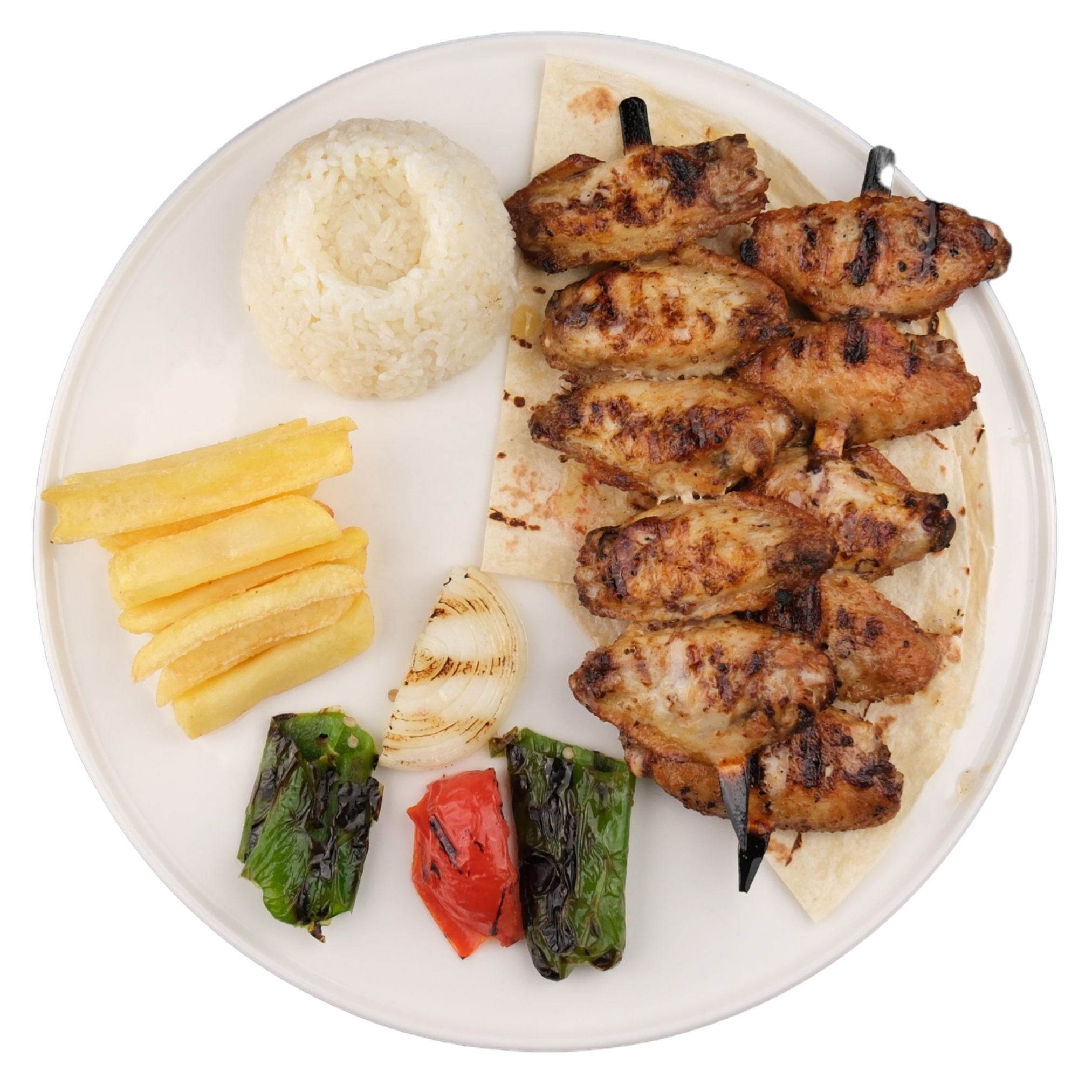 10 Adet Tavuk kanat, pirinç pilavı, ızgara domates, ızgara biber, ızgara soğan, lavaş ile