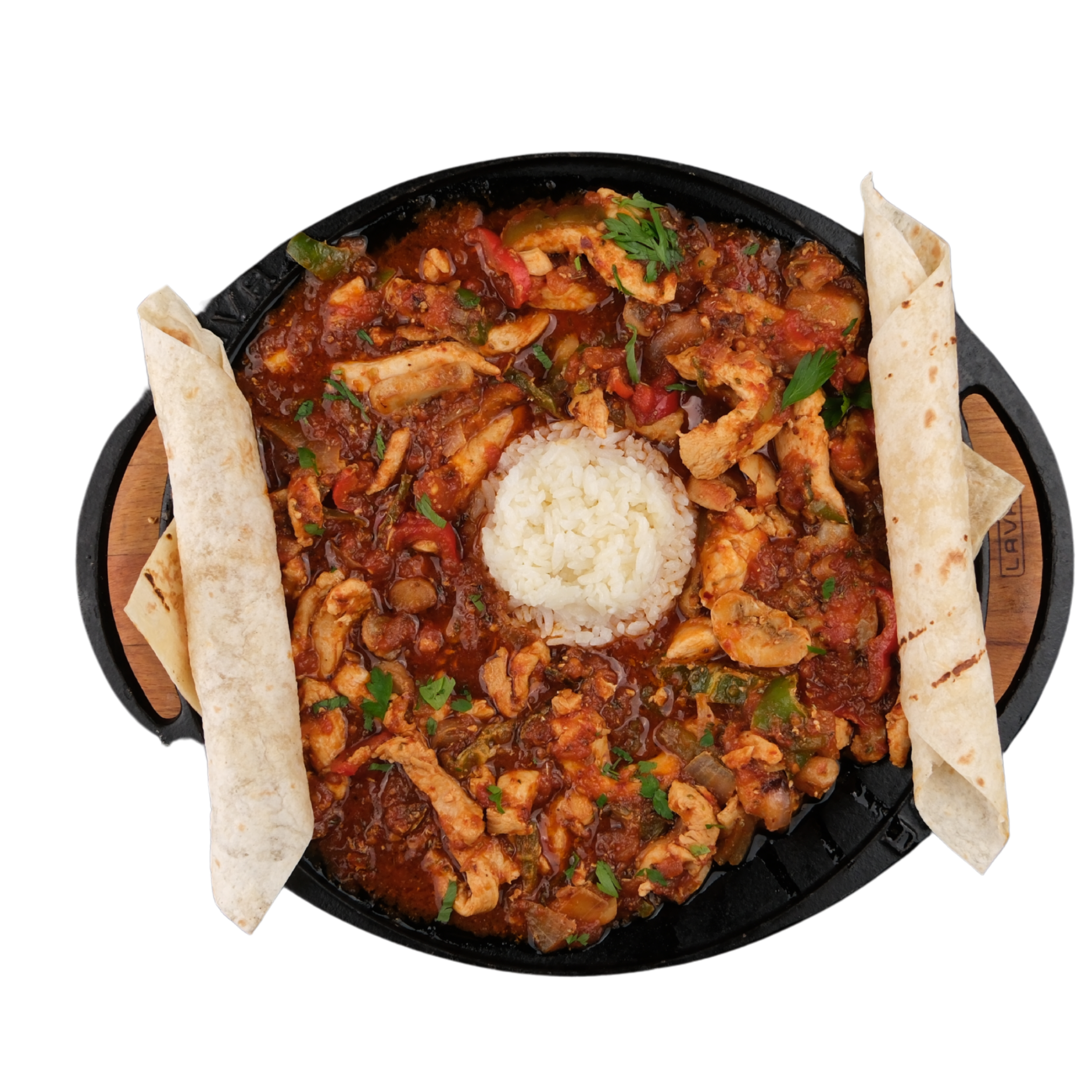 Jülyen tavuk parçaları, renkli biberler, soğan, özel domates sos, pirinç pilavı (2 Kişiliktir.)