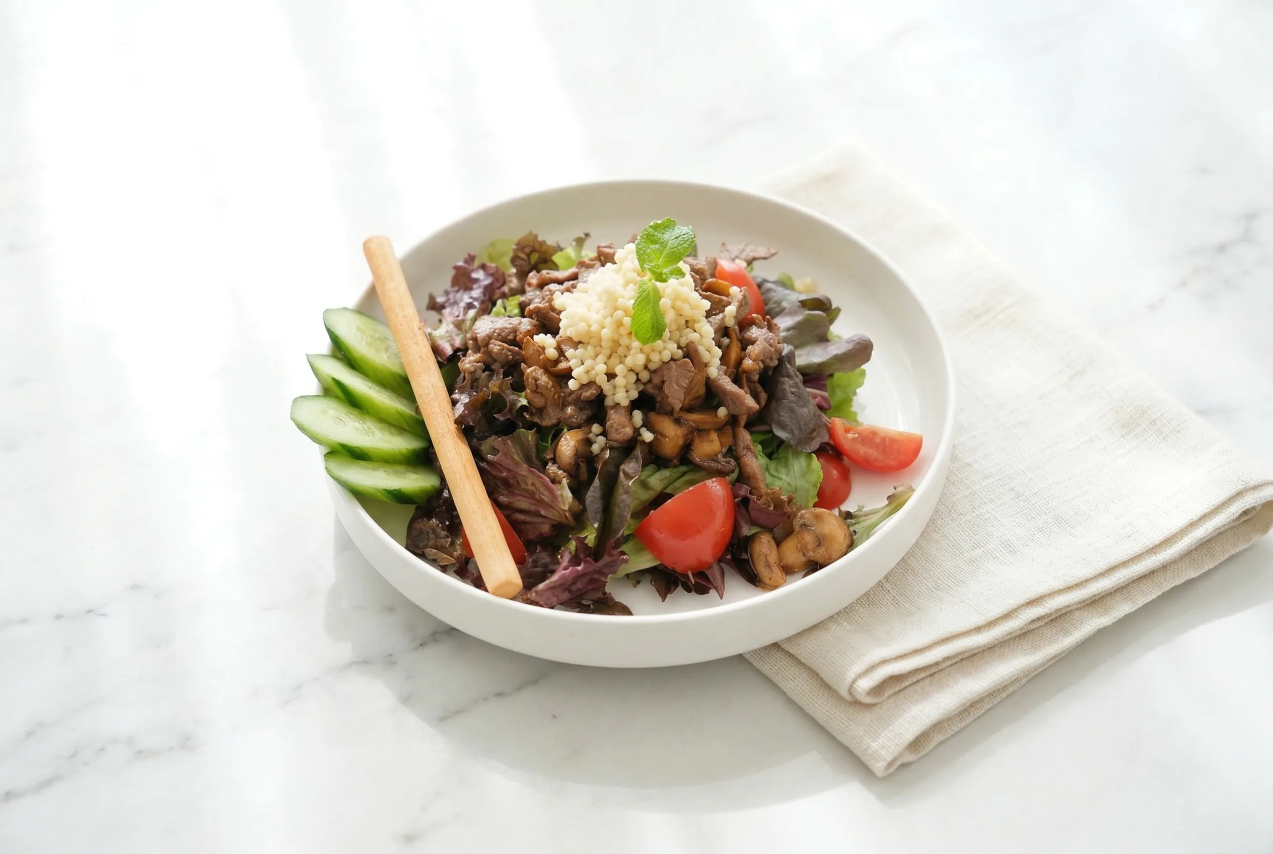 Mevsim Yeşillikleri, İnce Dilimlenmiş Dana Biftek, Kuskus, Mantar, Çeri Domates, Çengelköy Salatalık, Grisini, Sumak Ekşili Sos